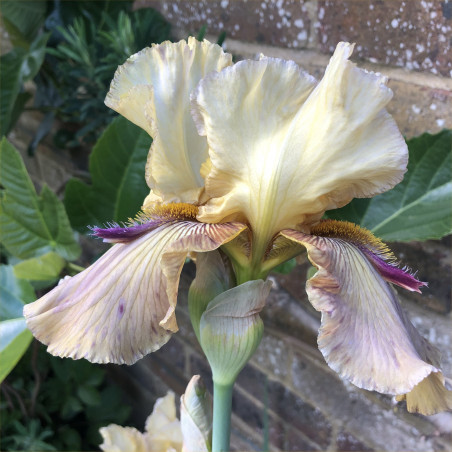 Lightly ruffled bloom with pale ecru standards and greenish tan falls, deeper at the hafts which are overlaid by deep violet lines radiating out from around beards and suffusing into the centre. Violet beard tipped mustard, with large violet horns