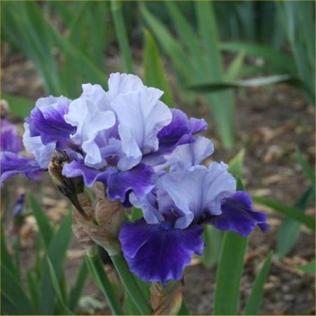 (Richard Tasco, R. 2003) Sdlg. 97-IB-01-10-RE. IB, 22" (56 cm), E-M & RES. wistaria blue (RHS 92C), midrib base flushed darker; style arms wistaria blue, darker midrib; F. dark violet (86A), slight reddish influence; beards medium blue violet, gold in throat; ruffled; slight musky fragrance. Mariposa Skies X Wizard's Return. Superstition 2004. HM 2006, AM 2008.