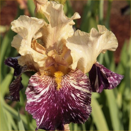 Ruffled, Broken patterned blooms. Toffee cream coloured standards with purple flecking. Purple falls streaked toffee and cream white. Beards are dark.