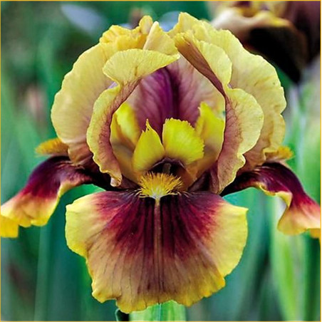 Bright tawny gold ruffled flowers with claret-based standards and claret-washed falls. Bright orange beards tipped bronze add the final touch. Two to 3 branches; 6 buds